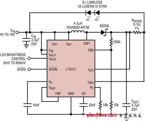 图3 所显示的 LT3477 升降压 LED 驱动器,以 1A 电流驱动两个大功率 LED。这两个 LED 无需以接地端为基准,连接的两个端子一般是转换器的输出和电池输入。LT3477 具备两个独特、和100mV 浮动电流感测输入接脚,此接脚连接与 LED 多串并联、且不以接地端为基准的电流感测电阻。在汽车电池的工作电压范围内以及低于此范围时,在电流直到 1A 的情况下都可实现准确的 LED 稳流。LT3477 的关机接脚用于达到车灯的接通/断开功能,并在未使用时将输入电流降至1uA(典型值为 100nA)。IADJ 接脚用来为刹车灯和尾灯应用,如后端讯号指示灯或刹车灯等实现高于 10:1 的模拟调光比,此类应用无需真实色彩 PWM 调光。