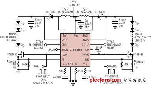 图2显示 LT3486 双组输出升压 LED 驱动器的应用,其以 100mA 恒定电流驱动两串 LED,LED 电压高达 36V。这个升压转换器以小电压感测电阻与 LED 串联和 PWM 调光 MOSFET 串列,并具有高效率。9V 至 16V 的整个电池电压范围低于 LED串联的电压。双通道 LED 驱动器驱动 20 颗 LED 组成的两个 LED串联,同时保持最高开关电压低于该积体电路的 42V 额定值,20 颗LED 组成的单串 LED串联则需要更高的电压。