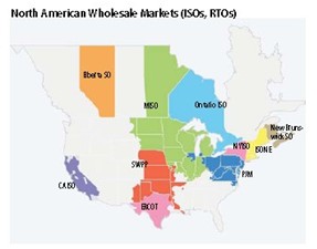 这三块电网区域中,一部分美洲区域---- New England, mid-Atlantic, Florida, Texas, California已经组织了批发市场,称为独立系统机构(ISO)或地域性传输机构(RTO)。查看下图,显示这些批发市场位置分布。