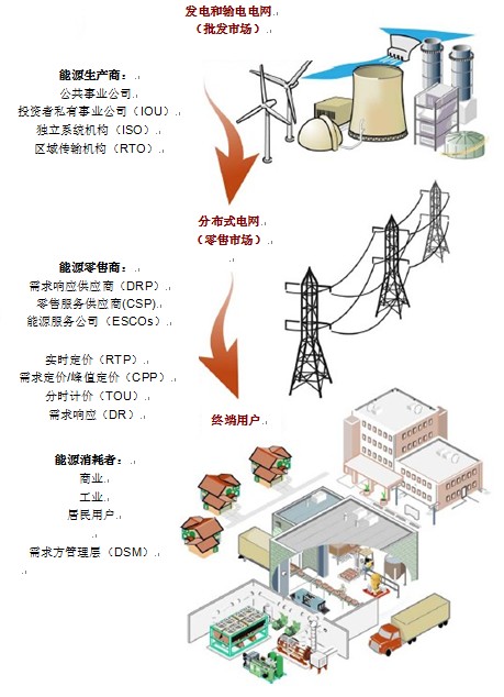 能源零售商负责电网的分配工作。需求响应提供商(DRPs)、变送服务供应商(CSPs)、能源服务公司(ESCOs),都属于零售组织。如在之前页面的图片显示,许多零售业为能源客户提供定价和需求响应规划。