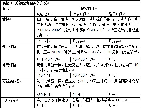 该集成、重叠陈列运行,以保持电网供需平衡,配套服务是主要工具。下面的表格为您显示这些配套服务----管控、连网储备、补充储备、可替换储备。确定足够的能源,以防额外的需求或电网扰乱。请注意配套服务是由运行速度快慢而指定的,管控最多1分钟,连网储备最多10分钟。