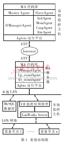 系统由LON网络层、本地监控层和基于移动代理计算模型的远程监控层三层结构组成,如图1所示。