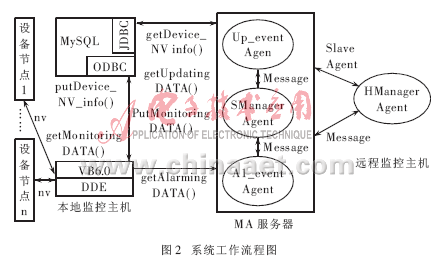 (3)SManagerAgent接收到服务请求消息对象后,加载并启动Up_eventAgent和Al_eventAgent。Up_eventAgent定期检索MySQL数据库,获取现场设备节点运行状态信息和网络输出变量信息,并通过消息对象传送给HManagerAgent,远程实时刷新各节点设备信息。若VB获取的设备信息为报警数据,则VB还必须实时地将数据复制到移动代理服务器的系统共享剪贴板。Al_eventAgent通过剪贴板可实时地粘贴报警数据,并将报警数据实时传送给HManagerAgent,实现远程实时数据报警。