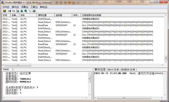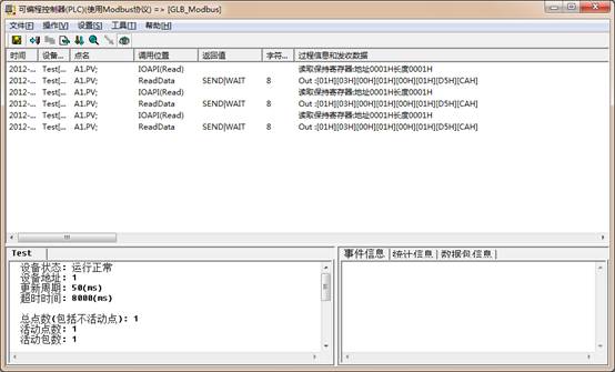 现在可以看到,驱动调度程序显示通讯信息;如果没有显示,重启工程或点击菜单,操作->重置所有设备。驱动调度程序显示通讯信息,如下图所示: