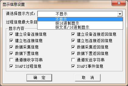 显示方式设置为16进制显示或按文本/16进制显示,具体选择哪一个,视驱动通讯协议而定,如果设备驱动协议是ASCII码,建议选择按文本/16进制显示;如果设备通讯协议是二进制方式,建议选择16进制显示。