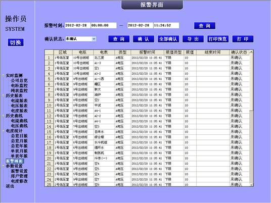 6报警界面如下。系统自动记录下来,本界面可以查询到所有的报警信息,并且可以有确定操作,打印,导出等功能。