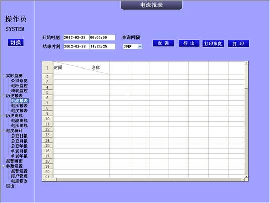 3历史报表界面如下。可以通时间查询到各个时刻各个电表的电流、电压、电度的值。可以导出excel,打印等操作。