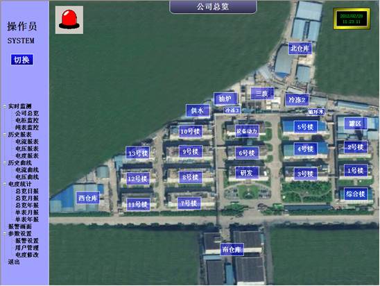 背景为公司的俯视图,把用电的生产车间或者办公室标注上了。点击蓝色的按钮,就可以查看该车间的电表实时数据。