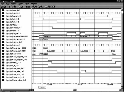 I/O、memory空间读写过程非常相似,现对memory空间猝发方式写操作进行详细的说明。在图4中,通过测试文件生成pci_rst#=1,不产生复位动作,地址节拍pci_ad=0x2000_0000,表示PCI主设备从系统地址0x2000_0000地址开始写到终端0x00000地址开始的数据空间,可在"PCI顶层模块"定义(bkend_ad[190]=pci_ad[190]),终端只取系统地址的低20位地址。pci_cbe#[30]=0111,表示是memory空间写操作,在idle状态pci_frame#使能,irdy#、devsel#、stop#先不使能,PCI主设备将地址送到终端地址线上,data_stop#=1,表示终端支持猝发方式数据写操作。在下个时钟周期,进入到rw_wait状态,base_regionl#(memory片选)使能,告诉终端准备执行memory写操作,同时打开I/O、memory空间写操作使能。在下个时钟周期,进入到rw_wait2状态,如果终端使能ready#,表示终端准备好接收数据,使能devsel#、tr dy#、date_write#,其中date_write#使能,是让终端产生写使能信号。irdy#、trdy#使能。表示PCI主设备和终端数据可以有效传输,通过测试文件在PCI主设备的对应地址(0x2000_0000)下产生数据cdef0000,在该状态,写入终端第一个数据cdef0000.在下个时钟周期,进入到rw状态,如果在该状态下pci_frame#=0还使能,表示PCI主设备想支持猝发写,继续使能devsel#、trdy#信号,stop#不能使能,因为PCI主设备准备猝发写操作,在该状态下,只要pci_frame#=0(使能),循环写入数据cdef0001、cdef0002、cdef0003、cdef0004,上文已经介绍,下一个数据对应的地址自动加一,地址都是线性增加的。图4中,PCI主设备准备发送cdef0005数据时,irdy#=1(不使能),表示PCI主设备正在取数据,data_write#(终端写使能)不使能,告诉终端等待PCI主设备取数据,插入等待周期。在下个时钟周期,irdy#重新使能,date_wri te#也重新使能,继续写数据cdef0005,这样可以一直写数据。pci_frame#=1,表示进入最后一个周期的写数据操作,关闭irdy#、devsel#、base_regionl#使能。在下个时钟周期,进入到backoff状态,在下个时钟周期进入到idel状态,一个完整的memory猝发写就完成了。