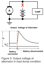 当引擎开始工作,电池从电源线上断开,发电机继续为汽车的电源线输出电流,这是产生浪涌电压的最糟糕的情况。这种情况就是所说的“甩负荷”,大多数汽车制造商和行业协会都会针对这种甩负荷状态,制定最高电压、线路阻抗,和这种甩负荷状态的持续时间,如图5所示。甩负荷的源阻抗高于正常条件下瞬态测试时的阻抗,因为电池已经断开,只有发电机在向外输出电能,这时发电机的内部线圈的作用就象一个限流电阻。