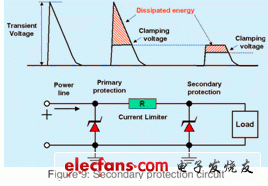 在电源线上增加电阻R可以减小瞬态电流,这样就可以使用更小功率等级的TVS做为二次保护。在电子单元中的微控制器和逻辑电路需要的电流是150mA~300mA,在-18℃下12V电池的最小输出电压是7.2V,同样条件下24V电池的最小输出电压是14.4V。在同样条件下的24V电池中,在300mA负载、R = 20 Ω的条件下电源电压是8.4 V,在R = 10 Ω和14.4V(24V电池在-18℃下的最小电压)条件下为11.4V。