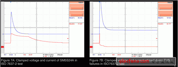 图7A:在ISO 7637-2测试中SM5S24A的钳位电压和电流 图7B:在ISO7637-2测试中甩负荷TVS失效情况下的钳位电压和电流