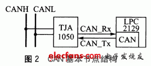 CAN节点硬件电路主要包括带有CAN控制器的微控制器和用于数据收发的CAN收发器。本设计使用的是NXP公司的32位微控制器LPC2129,它带有 CAN控制器,主要负责CAN的初始化和数据处理。CAN收发器种类有很多,本设计使用Philips公司的CAN高速收发器TJAl050。CAN基本节点结构如图2所示。