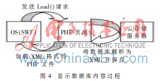 (2)当系统软件(SWF文件)进行显示数据库内容操作时,由SWF向PHP发送Load()请求,PHP将数据库内容解析成XML格式后由SWF文件进行加载和显示,完成整个通信过程。如图4所示。