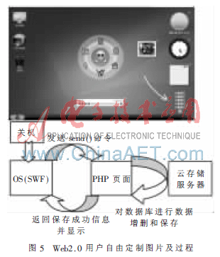 Web2.0相比于Web1.0的优势是强大的用户交互性。基于Web2.0的OS中用户既是系统的使用者,又是系统的创造者。为了实现用户交互,本OS中预留了丰富的定制空间,用户可以根据个人爱好添加或删除功能,数据信息会在用户关闭OS时,由ActionScript中send()命令操控PHP网页对数据库进行数据增删和保存,并把保存是否成功的信息返回给OS,完成整个功能自由定制过程。如图5所示。