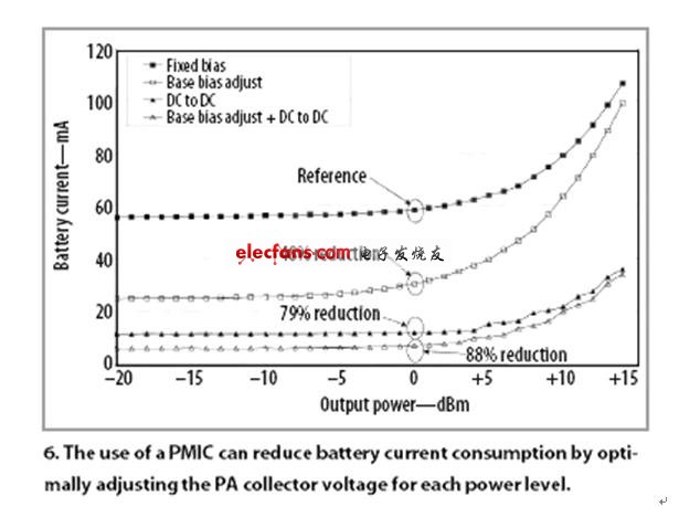 图6显示了如何利用功率管理来降低电池的耗电量。图中所示为当PA集电极电压在每一个功率级上被最优化调节时测得的电池耗电量。此数据表明,相比没有集电极电压调节的PA,在0dBm时,电池耗电量可以降低约79%。降低电池耗电量的另一种方法是采用模拟偏置控制技术。RF6285和RF6281 PA都设计有偏置电路,可以对控制电压(Vctrl)进行调节,这样,在较低的功率级上,PA可以更低偏置。相比无基极偏置调节的PA,通过调节Vctrl,电池耗电量可以降低48%左右。图6中的“基极偏置调节”曲线显示了只改变PA基极偏置的结果。要进一步降低电池耗电量,在较低的功率级上,PA基极偏置和集电极电压都要减小。如图6所示的“基极偏置调节+DC-DC”曲线,最终对电池电流的影响是减少约88%的电流。利用这种控制电压组合,在0dBm以下的放大器输出功率级上,PMIC和PA所消耗的总电池电流小于7mA。