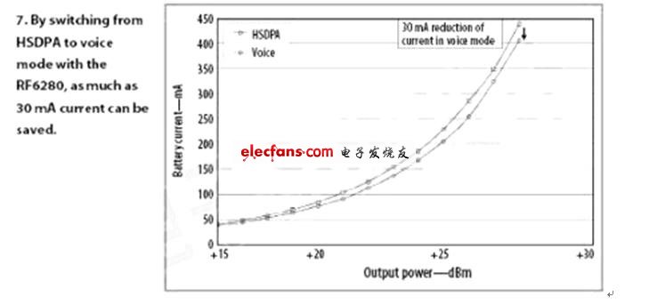 相比HSDPA调制信号,语音调制信号的峰均功率比要更小。由于手机必须工作在两种模式下,故PA偏置须足够高到维持充分的线性度,以达到系统相邻信道泄漏比(ACLR)要求。一旦PA偏置电压的设置符合HSDPA要求,在语音工作模式下,这些相同的电压级可提供额外的ACLR余裕(ACLR margin)。由于这种额外的ACLR余裕并非必需,故可能会牺牲ACLR性能以节省更多的电池耗电量。图7中,在语音工作模式下,通过减小HSDPA工作模式中所设置的控制电压,在最高功率级上可节省30mA的耗电量。这种灵活性让设计人员能够根据工作模式对线性度余裕、斜率和功率进行权衡取舍。