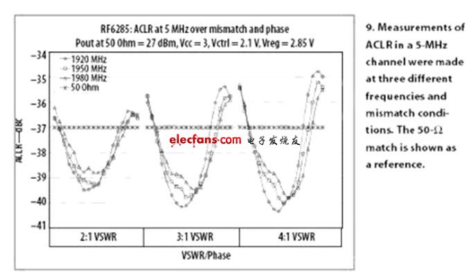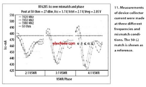 图9所示为测得的RF6285的ACLR性能与VSWR的关系,从中可看出PA正交架构的优势。作为参考,在3.0:1的最坏情况VSWR下,ACLR下降不到2dB,而单端PA时为10dB。对于3.0:1的最坏情况VSWR,RF6285的功率下降只有2.5dB,相同情况下单端PA则为3.5dB(图10)。图11显示了RF6285的峰值集电极电流与VSWR的关系。在2.0:1最坏情况VSWR下,RF6285的峰值集电极电流只增加了3%,而相同条件下单端PA的增加了20%之多。