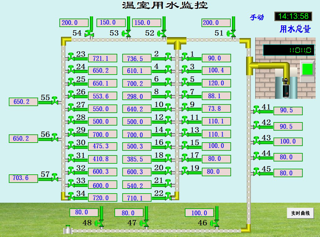系统可通过组态画面实时显示各个温室大棚的数据信息,包括土壤墒情、棚内空气状况、喷淋灌溉状况等信息。实现数据的存储和管理,实现农业生产的标准化、网络化、数字化。