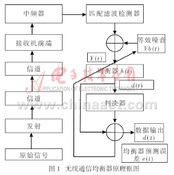 自适应均衡器的工作过程包含两个阶段,即训练过程和跟踪过程。典型的训练序列是伪随机二进制信号或一个固定的波形信号序列,紧跟在训练序列后面的是用户消息码元序列。接收机的自适应均衡器采用递归算法估计信道特性,调整滤波器参数,补偿信道特性失真,训练序列的选择应满足接收机均衡器在最恶劣的信道估计条件下也能实现滤波器参数调整。所以,训练序列结束后,均衡器参数基本上接近最佳值,以保证用户数据的接收,均衡器的训练过程成功了,成为均衡器的收敛。用户数据序列需要被分割成数据分组或时隙分段传送。均衡器通常工作在接收机的基带或中频信号部分,基带信号的复包络含有信道带通信号的全部信息,所以,均衡器通常在基带信号完成估计信道冲激响应和解调输出信号实现自适应均衡算法等。无线通信均衡器原理简图如图1所示。