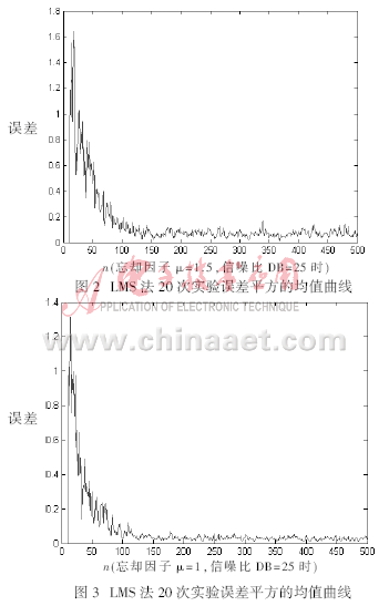 采用基于LMS和RLS的自适应均衡算法分别进行实验,画出一次实验的误差平方的收敛曲线,给出最后设计滤波器系数。一次实验的训练序列长度为500。进行20次独立实验,画出误差平方的收敛曲线。采用基于LMS的自适应均衡算法,在相同信噪比,忘却因子分别为μ=1.5、μ=1和μ=0.4的情况下,20次实验误差平方的值曲线分别如图2、图3和图4所示。采用RLS法,在相同信噪比,忘却因子分别为μ=1、μ=0.8和μ=0.6的情况下,20次实验误差平方的均值曲线分别如图5、图6和图7所示。