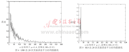 通过上述仿真结果可以看出,观察三个不同步长情况下的平均误差曲线,步长越小,平均误差越小,但收敛速度越慢,为了好的精度,必然牺牲收敛速度。RLS算法的收敛速度明显比LMS算法快,并且误差也比LMS算法小。当忘却因子趋于0时,RLS算法也就是LMS算法。