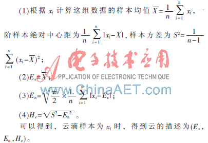 逆向云发生器实现定量数值到其定性语言值的转换,即从给定的云滴样本中求出正向云发生器的3 个特征数字,从而实现对样本数据的定性评价。