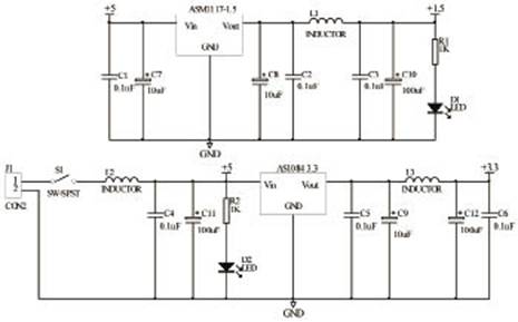 由于采用线性调节原理,LDO本质上没有输出纹波。与LDO相比,DC/DC调整器输出纹波电压较大、瞬时恢复时间较慢、容易产生电磁干扰(EMI)。系统电源输入电压为5V,3.3V电压供电部分采用了ASl084;此外,对于FPGA的PLL工作需要的1.5V电源部分,采用AMS1117-1.5 LDO来实现。