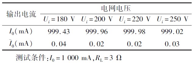 电源稳定度测试数据如表1 所示。其中电源稳定度是指在容许电网波动范围条件下,对输出电流稳定度的影响。测试条件为I0 =1 000 mA,RL =3Ω,测试数据表明电网电压在180 V ~250 V 波动时,输出电流最大偏差为0.99 mA,纹波电流小于0.05 mA,输出电流和纹波电流均达到设计要求。