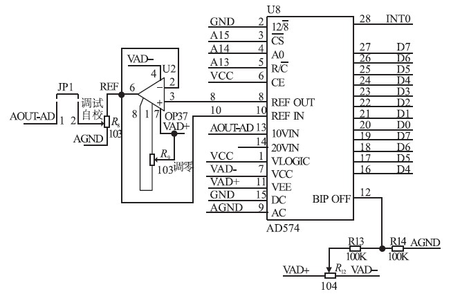 A/ D 采样输入电路如图4 所示。为了满足取样精度需要,我们选择12 bit A/ D 转换器和12 bitD/ A 转换器,使步进小于1 mA,在电路中A/ D 启动后,先读高8 位结果,再读后4 bit;D/ A 是先写入高8 bit,再写入低4 bit.