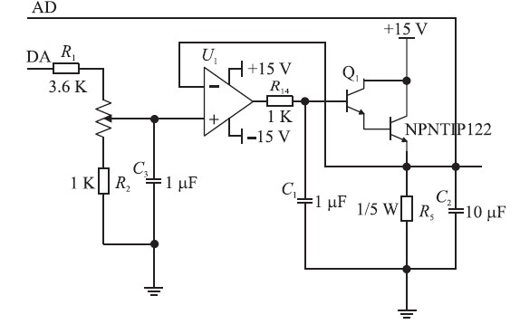 恒流源电路原理结构图如图2 所示,由于D/ A转换输出的模拟信号不稳定,加上C3 稳定电压。经过3.6 K 的电阻和1 K 的电位器加到单运放OP07 的同相输入端,调节电位器的阻值的大小可调节同相输入端的电位,从而改变输出点的电位,输出电位加到达林顿管的B 管脚上,进入达林顿信号产生自激信号,通过C1过滤掉。利用达林顿管的电流放大特性,可实现大电流的输出,电流放大倍数为1 000 ~15 000倍。