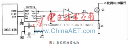 如图3所示,数控恒流源电路用于给被测有机电致发光二极管提供数控的恒流源。通过设定所需的电流,经微控制器以数字量形式输出,由D/A转换器转换为模拟量电压值,该模拟信号输入运放LM324的同相端。由于反相端与同相端电压相等,实际输入的电流即为反相端输出电压与电阻R3的比值,将该电流通过Q2漏极输出提供给被测发光器件,等效于在被测器件上加入给定数值的恒流源。