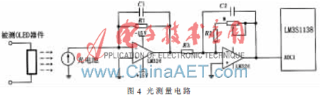 光测量电路如图4所示,使用波长范围为380 nm~800 nm的光电池,由于光电池的输出电流很小,电路中还需要对微弱的电流信号进行转换及放大,再经过微控制器自带的A/D转换器转换,微控制器对转换后的数字信号进行运算,判断输出电压值是否衰减到了原来值的一半,即被测器件的发光亮度是否衰减到了原来的一半。