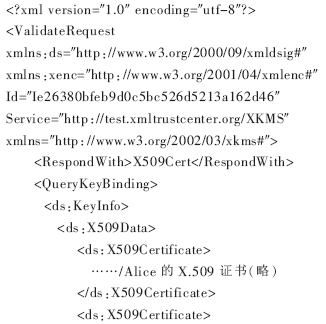 下面通过实例给出证书验证的实现过程。XKMS服务收到用户Bob提交的验证Alice证书的请求后,调用OCSP服务(图1中验证协议模块)进行验证。Bob发送的XML格式的请求描述如下: