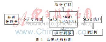 根据设计思路的基本认知原理,系统采用脉搏监测的方式来监控睡眠,在不影响正常睡眠的情况下,利用脉搏传感器采集人体脉搏信号,构建嵌入式系统监测使用者的睡眠状况[4],在睡眠质量不佳的情况下,利用嵌入式微处理器发出合理的声音刺激以达到提高睡眠质量的目的。整个系统由脉搏采集模块、信号调理模块、微处理器模块、声音刺激模块、数据存储模块及数据显示分析处理平台等构成。系统结构框图如图1所示。
