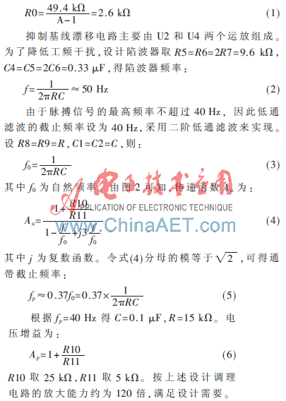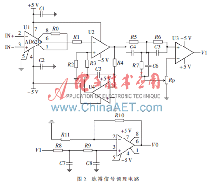 人体的脉搏信号具有幅度小、干扰强、阻抗高、频率低等特点,采集过程中容易引入外界干扰(如工频干扰、人体活动、高频干扰和人体呼吸移动引起的基线漂移),常伴有严重的背景噪声[5]。因此,脉搏信号测量必须经过放大和滤波等处理,才能满足信号采集的要求。图2为脉搏信号调理电路。