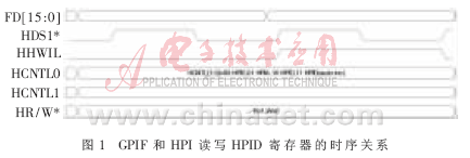 本实验采用CY7C68013和TMS320C6713芯片。在GPIF接口部分,IFCLK设置为48 MHz内部时钟,使用16位宽的数据总线(设置WORDWIDE=1),分配CTL[2:0]控制HPI的时序。使用GPIF Tool生成波形描述符,分别用于HPIC/HPIA/HPID的读写控制。值得注意的是:由于HDS1*/HDS2*/HCS*相关,可以使HCS*有效,HDS2*置“1”,并通过HDS1*控制选通;HHWIL控制传输的是第一半字还是第二半字;HCNTL[1:0]决定哪个寄存器正被访问[3]。由于采用DIN连接器,其传输速率最高可达几十兆赫兹,这也是其传输瓶颈。如果采用手工单独装配的SMA硬件连接器,其硬件连接的速度完全可以满足GPIF和HPI的要求。当然,前者每个引脚的成本不到后者的百分之一[1]。图1为GPIF和HPI读写HPID寄存器的时序关系图。