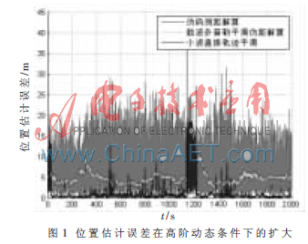 图1所示为载体具有加加速度条件下,基于伪码测距的解算、基于载波多普勒平滑伪距的解算及基于小波直接轨迹平滑得到的一组位置估计仿真结果。仿真中载体从第1 140 s开始进行变加速运动,其最大加加速度为50 m/s3。从图中可以看出,基于伪码测距的解算算法估计误差方差较大,而后两种算法在载体具有高阶动态时会发生误差扩大的现象,因此并不适合高动态条件下的应用。
