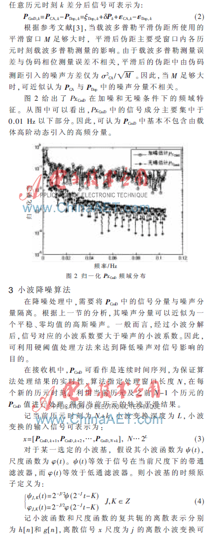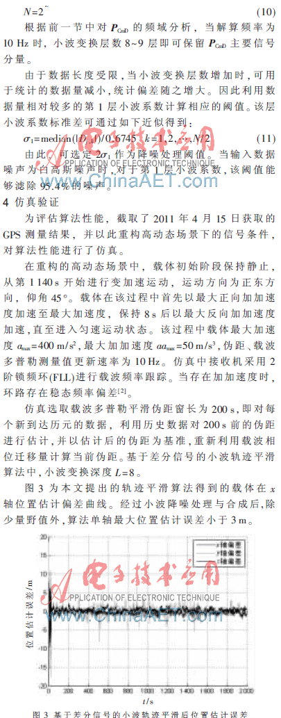 参考文献[4]提出的WaveSmoothTM算法通过对伪码测距与载波相位测距间偏差进行小波分析,选取合适的小波变换尺度和数据长度对信号进行降噪处理。具有较低的运算开销和较好的实时性能,并且比传统的时域平滑算法和频域滤波方法能够更好地滤除伪距测量中的低频噪声分量。