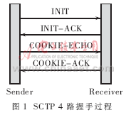 TCP中的连接是指2个TCP端点通过3次握手过程建立的由一对传输层地址识别的传输通道。在SCTP中TCP的连接被引申为由4路握手建立的关联(association),SCTP 4路握手过程如图1所示。4路握手有效地保护了服务器不受拒绝服务攻击(Denial of Service,DoS)。