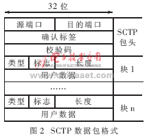 SCTP的包格式如图2所示。每个连接可以包含多个流,每个流都通过它的流ID来确定。而流的个数在前面叙述的4路握手中定义。每个数据块都属于一个流;每个流都独立地递交给应用层。流的独立递交解决了TCP中存在的队头阻塞问题。当多个逻辑会话通过一个TCP连接传输时会发生如下现象:当网页中包含有图像时,图像和文本通过一个TCP连接传输。如果图像数据丢失,文本数据的传输就必须等待图像数据重传。这样,一个逻辑会话就会因为另一个逻辑会话的丢失而阻塞。该现象在http/1.1中常发生。当使用SCTP作为传输协议时,每个应用层级的会话都会被分配到各自的流中,这样,一个流中数据的丢失不会影响其他流的传输。