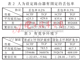 表1、2、3是仿真试验的结果。在每个仿真中,为避免慢启动影响试验结果,在计算平均延迟时忽略前1 000个数据包。另外需要说明的是,3个表中的置信区间均指SCTP和TCP的延迟差置信水平为95%的置信区间。