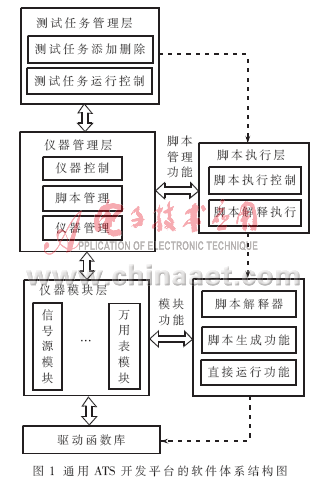 该层作为中间层,主要实现向上提供统一的调用接口,对下层的仪器模块实现管理。另外,该层还完成脚本的管理、编辑,在该层实现测试任务脚本的生成。