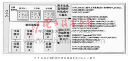 测试任务的自动生成首先建立在被测设备的全面分析的基础之上,通过分析理清被测设备输入和待测信号的关系,根据测试任务需求,用户在信号对应的仪器模块的软件界面上直接操作仪器,比如使用数字IO配置信号通道,使用射频信号源发送射频信号,使用射频分析仪进行频谱分析。在对应软面板操作结束后,其仪器模块中的解释器将完成对操作记录的转化,生成相应的操作脚本。在一系列操作能满足测试需求后,整个测试过程将被以脚本的形式记录保存。在需要重现某一测试任务的测试过程时,仪器操作脚本可以被脚本执行层统一调度后解释执行,通过预定义的交互接口,调用程序能方便快捷地得到测试返回结果。图3给出该技术的基本原理。