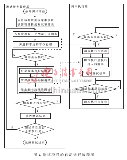 生成的测试任务脚本利用测试任务管理层可以添加到数据库中,通过分析被测设备的测试要求可以构建整个测试项目的不同层次的测试任务,比如通信设备的整机测试、板级测试、功能模块测试、元器件级测试。当执行一个故障测试时,测试任务的自动运行由测试任务管理层提交测试脚本给脚本执行层开始,到脚本执行层解释执行完脚本后结束,测试项目的自动运行流程图如图4所示。