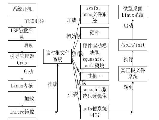 计算机开机自检, BIOS 引导到USB 接口的磁盘设备,通过启动引导管理器Grub,加载Linux 内核文件vmlinuz,内核将初始化内存盘initrd.img-2.6.27.27加载到内存,形成一个临时根文件系统,通过执行Initrd 中的init 可执行文件,进行sysfs、proc 文件系统的加载,并对硬件进行初始化,相关硬件驱动、squashfs、aufs 模块的加载后,挂载系统只读镜像system.squashfs,并通过联合文件系统aufs 使其可写,然后转到真正的根文件系统执行命令/sbin/init,完成微型桌面Linux 系统的启动。