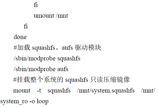 Initrd(boot loader Initialized RAM Disk 的缩写),由boot loader 初始化。本系统使用的boot loader 为GNU GRUB 0.97.如果Grub 已配置Initrd,Linux 内核在启动前,会把存储设备中的Initrd 文件加载到内存,作为一个临时根文件系统;内核启动时通过先执行Initrd 中的init 文件,完成设备驱动模块和squashsf、aufs 文件系统模块的加载,并完成真正的根文件系统的挂载,然后执行系统中的/sbin/init 进程。