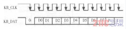 PS2 键盘传输协议是以下面的数据格式进行数据传输的:1 个起始位(总是逻辑0),8 个数据位(低位在前),1 个奇偶校验位(奇校验),1 个停止位(总是逻辑1),1 个应答位(仅用于在主机对设备的通信中)。键盘的发送时序如图2 所示。