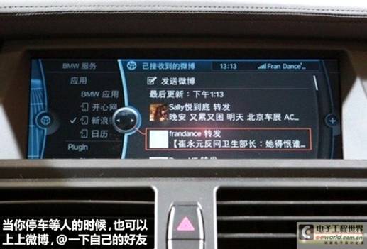 当然,宝马在设计的时候也考虑到了用户的使用安全,尤其是车载电子系统的安全问题,做了一些限制,比如平视显示系统只显示车速、导航等主要行车信息,而不会显示任何娱乐信息。同时,诸如微博等应用功能也会在高于10公里/小时的时速下自动锁定,确保驾驶者的注意力都集中在安全驾驶上面。