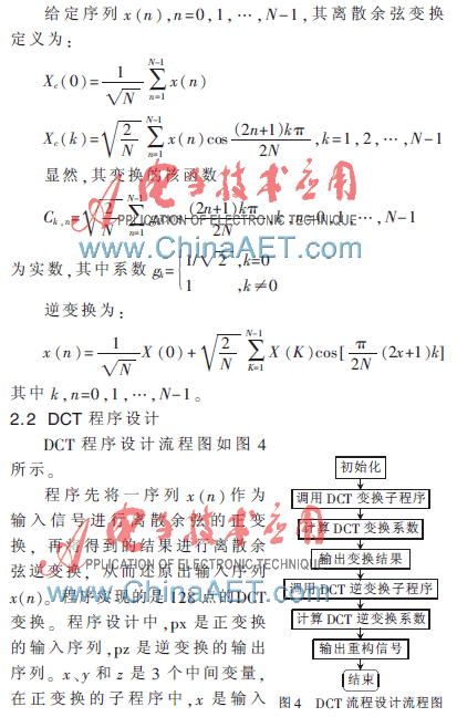 (1)由于FFT算法的普遍采用,直接利用FFT实现DCT变换的快速算法相对容易。但是这种方法也有不足之处,即计算过程会涉及复数的运算。由于DCT变换前后的数据都是实数,计算过程中引入了复数,而一对复数的加法相当于两对实数的加法,一对复数的乘法相当于4对实数的乘法和两对实数的加法,显然是增加了运算量,也给硬件存储提出了更高的要求。